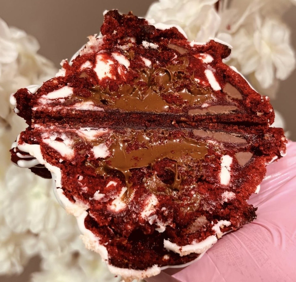 Suave galleta de terciopelo rojo con su color vibrante y sabor delicadamente achocolatado. Una textura esponjosa y húmeda que se deshace en el paladar, con notas sutiles de chocolate blanco y oscuro que crean esas expreriencias unicas del clasico Red Velvet (Rellena de Nutella)
